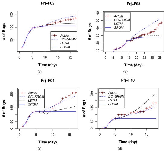 Figure 7a–d plot the results when applying DC-SRGM, LSTM, and Logistic models to the F02, F03, F04, and F10 datasets at the middle of the projects, respectively. The predicted number of bugs by DC-SRGM described the potential number of bugs more correctly than the other two models. Hence, the industrial and OSS datasets results indicated that DC-SRGM outperformed LSTM and the Logistic model and improved the prediction accuracy when applied in an ongoing stage of industrial development. For OSS projects, DC-SRGM significantly outperformed the Logistic model, and, on average, DC-SRGM was better than LSTM. However, its performance slightly decreased in the industrial environment while the performances of the LSTM model increased.