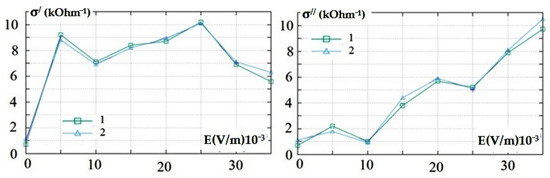 The dependences of conductivity on the electric field strength are modeled by the method proposed in the work and using the theory of generalized conductivity. The results obtained are shown in Figure 3. We wanted to show the effect of a small magnitude of the electric field voltage. This is due to the study of fundamental physical phenomena, in particular, the study of the electrocaloric (EC) effect in nanocomposites with a periodic structure [28]. It is the strength of a small electric field that makes it possible to detect such effects in periodic structures. At high electric field strengths, this effect can be neglected.