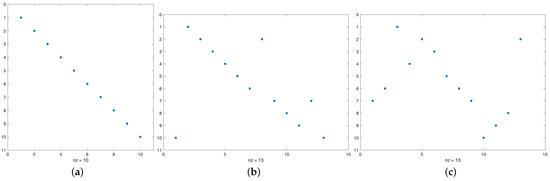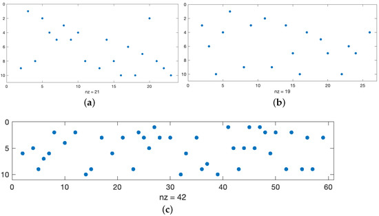 Let be any string of length n over the alphabet , and let . Given T and P, we look for the matches of P in T, that is the occurrences of symbols of P in T. Regions of identity (matches) can be visualized by the so-called dot-plot. A dot-plot is a binary matrix M such that the entry if and only if , otherwise . Some toy examples are shown in Figure 3 where the identity is visualized by a dot.