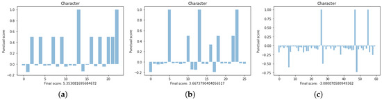 In the images of Figure 6, we illustrate the score as the bar graph obtained by visualizing each value assigned to each symbol of the sequences as a bar. Let us notice that bars of positive height correspond to the score of matches, whereas bars of negative height correspond to the score of deletions. Matches can be scored with values lower than 1, when repeated; deletions are scored differently depending on repetition, frequency, and distance from the next symbol objective.