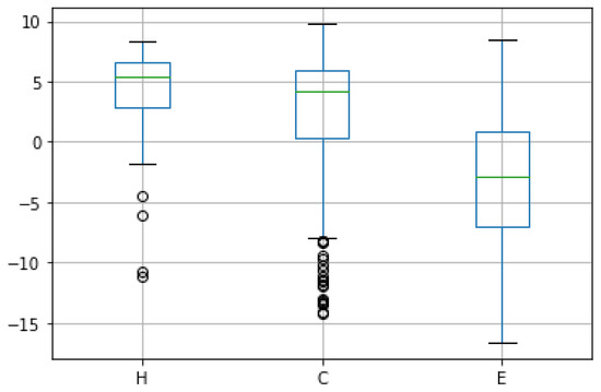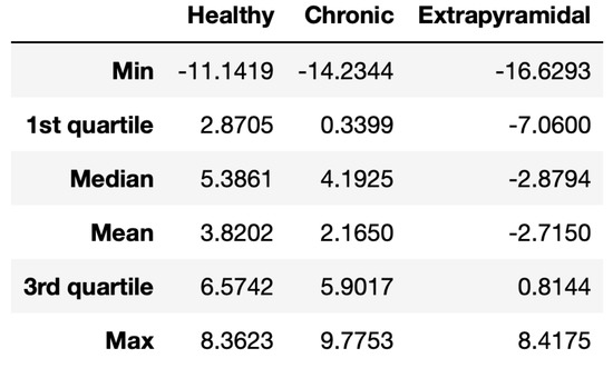 Before the analysis, we dropped some outliers for each class, according to the Chebischev Theorem. Setting , we were sure to retain at least 75% for each class; such a dropping resulted in retaining 43 sequences out of 46 for the Healthy class, 265 out of 284 for the Chronic class and 44 out of 46 for the Extrapyramidal class.
