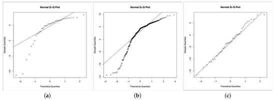 Q-Q plots for each patients’ class: (a) Healthy, (b) Chronic, and (c) Extrapyramidal.