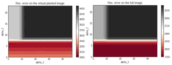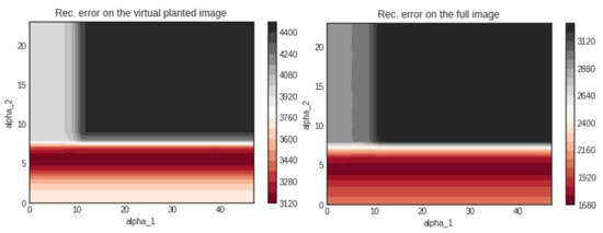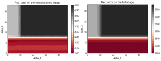 The reconstruction error in the case of 20 projections is plotted in Figure 2. The left hand side figure shows the error landscape as a function of the two hyperparameters on the planted shape only. The right hand side figure shows the error landscape on the full unknown image.