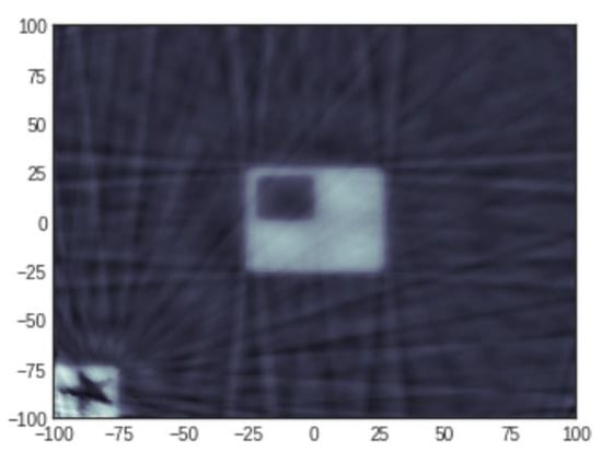 The result of the TGV-based reconstruction using our planted virtual image approach is satisfactory for the case of 100 projections as well. Convergence was reached after 11 min and 47 s via Colab on CPUs.