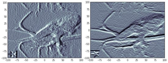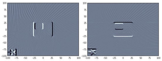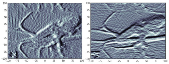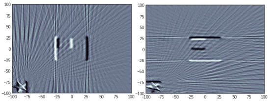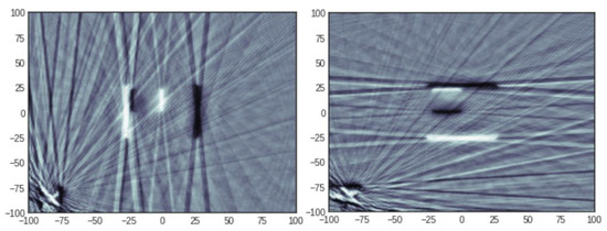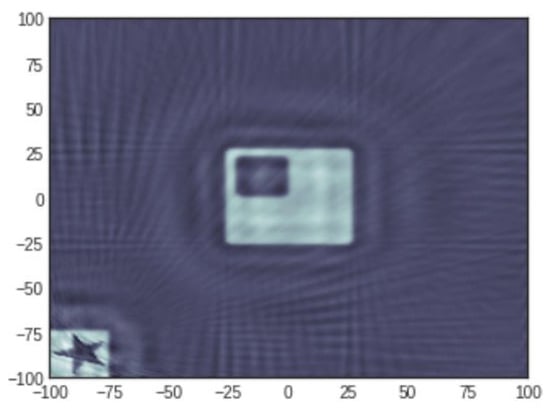 where is a penalisation function which promotes sparsity of the vector c to which it is applied. Although the most natural penalisation is obtained by taking p to be the sparsity, i.e., the number of non-zero components, this choice is rarely adopted because of its non-convexity and the fact that the resulting optimisation problem (2) becomes computationally intractable [10]. Compressed Sensing theory developed tools which permitted the understanding of when sparsity could be profitably replaced with the -norm, i.e., , or , where stands for Total Variation, which is a semi-norm (due to the fact does not imply that ) defined as the norm of the vector of local differences of the components of c, i.e., , where ∇ denotes the gradient, which readily extends to 2D or 3D objects. The main reason for these choices is that the resulting penalisation functional is convex and many efficient algorithms have been devised for such problems [11,12,13]. Oftentimes, different penalties are combined for promoting various properties of the reconstructed object and the resulting problem becomes