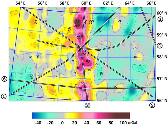 Figure 1. DSS profiles scheme with a map of a gravity field anomaly (XGM2019e_2159) in the Bouguer reduction. (1) Granit + Rubin-2; (2) Krasnouralskiy + Khanty-Mansiyskiy; (3) VNTO; (4) N. Sosva–Yalutorovsk; and (5) Rubin-1; (6) Sverdlovskiy.