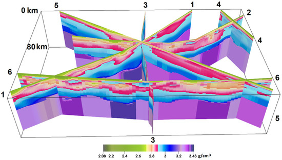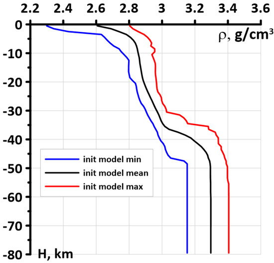 The initial density model frame is formed with the 2D density cuts along the regional profiles (Figure 2). The data between profiles are interpolated values (layer by layer) [3]. The mean value of density ρ 0 ( z ) (Figure 3) is calculated for each depth of the initial model (Figure 4). This 1D density distribution is continued outside the study volume and the excess density is calculated relative to it. As we seek 3D density distribution as a product of this function, ρ 0 ( z ) and some 2-dimensional corrective addition Φ ( x , y ) , the inverse problem for lateral density in a flat layer will be sufficiently stable [23,26].