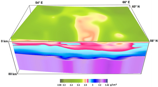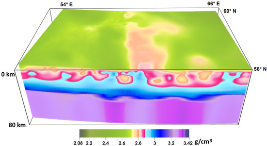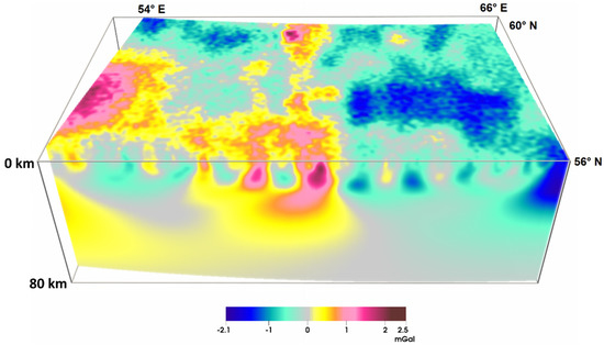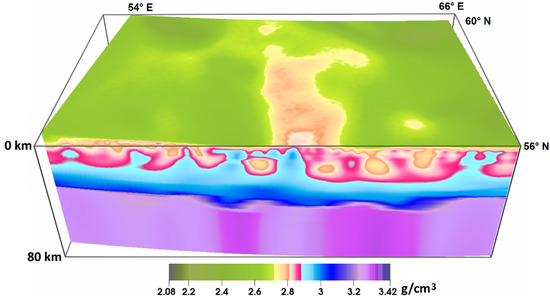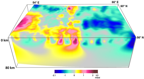 A density model that satisfies the observed data was constructed using the described method. The initial ρ 0 ( z ) distribution (Figure 3) was used as the input data. Resulting density model (Figure 10) consists of prismatic elements; resolution of this model is 1236 × 1314 × 80. Figure 11 shows the change in the intervals of densities between the initial and the fitted model.