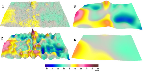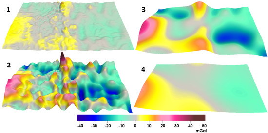 Figure 8. Examples of the different field separations. The minimum and maximum of amplitude of the field are also shown. The ranges of depths of the layer are (1) H ∊ [0, 5] km, Δg ∊ [−8.8, 15.1] mGal; (2) H ∊ [5, 20] km, Δg ∊ [−35.3, 54.3] mGal; (3) H ∊ [20, 40] km, Δg ∊ [−26.7, 34.8] mGal; and (4) H ∊ [40, 80] km, Δg ∊ [−12.2, 17.7] mGal. The masses in the layer are considered to be the sources of the separated field.