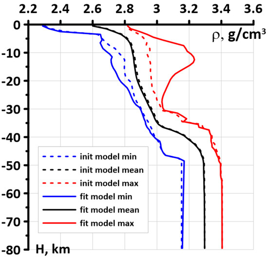 Figure 11. Graphs of the dependence of the minimum (blue line), maximum (red line) and mean (black line) density of the initial (dash line) and fitted (solid line) models on the depth.