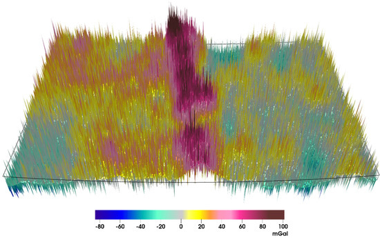 As can be seen, most of the noise has been filtered out. This is not surprising, because the basis of our filter is Lavrentiev’s regularization. The remnants of the noise “penetrated” to a depth of about 7 km. It should be noted that if we chose a set { κ i } i = 0 80 of smoothing parameters specifically for this case, then the noise could be completely neutralized. This, of course, would also be facilitated by the fact that our original observed field does not have a “high-frequency” component. From a practical point of view, the “noisy” (Figure 15) and “clean” (Figure 10) models coincide.
