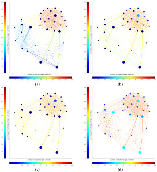 (a–d): Evolution of the strategy and infected people in Scenario B for timestamps , respectively. The color of the nodes represents the number of infected people in that node, while the color of the edges represents the percentage of people blocked.