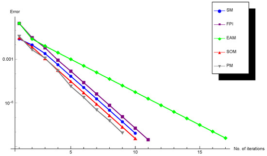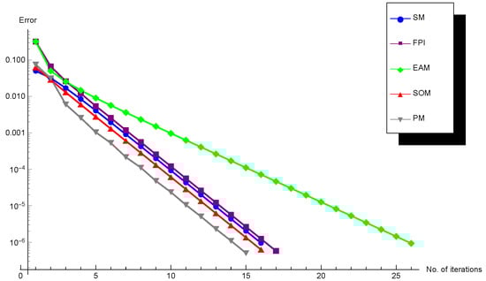 Here PM and SOM were employed along with (7) with and iterations and then (16) was used. Without imposing (7) the iteration schemes PM and SOM were faster than the other competitive ones, but the superiority was not tangible. Because of this, a multiple Newton’s method was imposed at the beginning of the iterations to accelerate the convergence as much as possible. The impact of the multiple Newton’s method is that it is useful when there is a clear smoothness around the zero of the nonlinear operator equation. It helps arrive at the convergence region much faster than simple root finders.