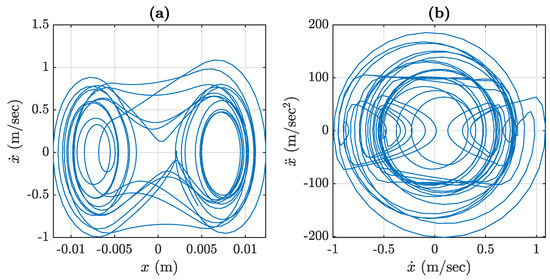 The following parameters of the system were used for the study: N · s/m, m, N/m, N/m, N, kg, rad/s. We use ode45 MATLAB solver with , and a constant stepsize s. With these parameters, the system demonstrates a chaotic behavior, as shown in Figure 3.