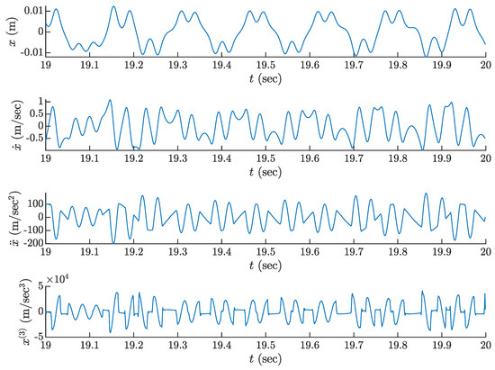 Figure 4 presents time series for successive derivatives of the displacement x up to the jerk .