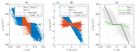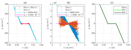 Let the accelerometer be mounted on a mass m, and its signal is sampled over time series . Let the driving force be known exactly, as well as the mass m and damping coefficient c, and the series for speed and displacement are obtained by integration. Rewrite the second equation of (22) in a form appropriate for parametric identification via least squares, corresponding to DIA: