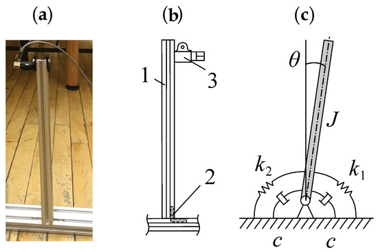 Panel (a) shows a photo of an experimental setup, panel (b) shows a drawing of the setup, where 1 is a vertical vibrating beam, 2 is an inner bracket and 3 is an accelerometer. Panel (c) shows the system schematics. The denoted angle in the panel corresponds to a positive direction of the beam tilt.
