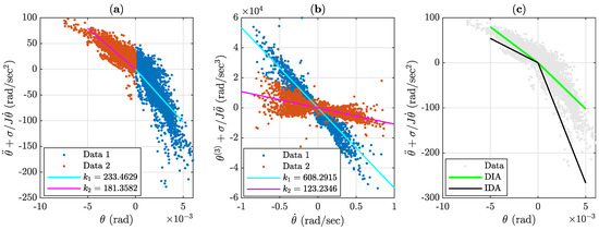 Results of the nonlinear beam identification with DIA and IDA. In both cases, Data 1 corresponds to negative tilt angle , Data 2 corresponds to positive tilt angle . Panel (a) illustrates results of DIA, panel (b) illustrates results of IDA, both results are shown in the panel (c). Being compared with IDA, DIA underestimates and overestimated , which corresponds to dynamics closer to harmonic oscillations rather then nonlinear ones.