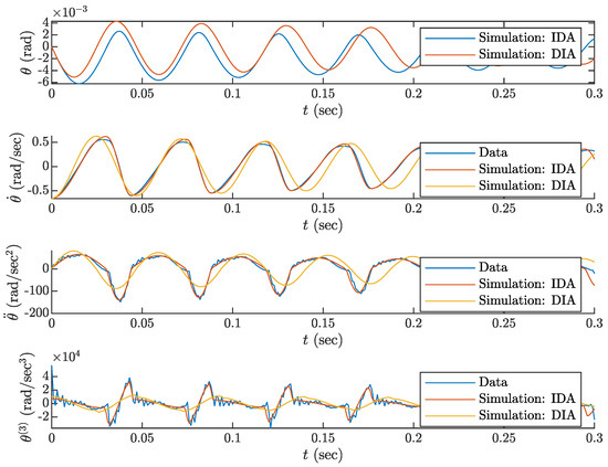 Fragment of time-domain signals representing various derivatives of angular displacement with comparison between real signals and two models obtained with the described identification approaches.