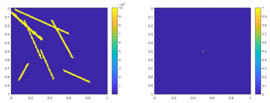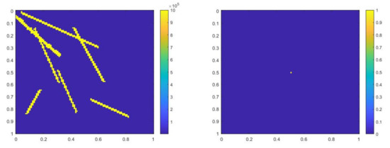 In the second example, we consider , , and is 1 at the fine-grid element containing and 0 otherwise. Figure 25 shows the permeability field and the source term . The reference solution, implicit CEM solution (with additional basis) and partially explicit solution at are presented in Figure 26. The relative error plot and relative energy error plot are shown in Figure 27. The partially explicit scheme also works in this case, and gives similar accuracy as the implicit CEM (with additional basis) scheme.
