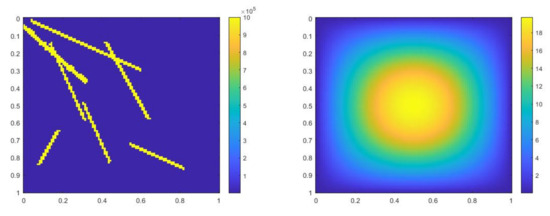 where . We use the more complicated permeability field and the smooth source term, which are shown in Figure 13. In Figure 14, the reference solution at the final time, implicit CEM solution (with additional basis) at the final time and partially explicit solution at the final time are presented. Relative error and energy error plots are shown in Figure 15. In this case, the relative error for the implicit CEM scheme is small and comparable to the two schemes with additional basis functions. From Figure 15, we can see that the and energy error for implicit CEM (with additional basis) and the partially explicit scheme are nearly the same. We note that the relative energy error of our scheme is slightly higher; however, the proposed approach is stable, as it performs similarly to the fully implicit method.