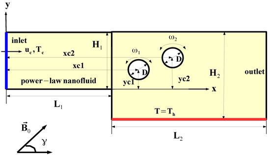 CHT for flow over BF-S geometry is considered for non-Newtonian nanofluid under the combined effects of inclined uniform MF and double rotating circular cylinders and it is schematically shown in Figure 1. Here, denote the channel lengths from inlet to step and from step to exit while and represent the channel heights. Two identical circular cylinders are placed behind the step with a size of while their center locations are and . They are rotating at rotational speeds (Rs) of and . Cold fluid enters the channel with a velocity and temperature , while the bottom wall starting from step location to exit is at a temperature . Other channel walls are adiabatic. The imposed MF is uniform with the inclination of . Impacts of induced MF, displacement currents and Joule heating are not taken into account with free convection effects. The nanofluid is water–alumina with different solid particle volume fractions (SP-VF) of alumina.