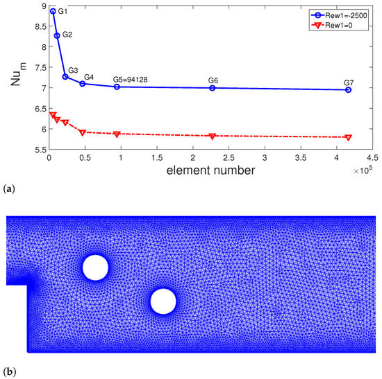 Numerical test results are shown for the variation in the average Nu number with different grid sizes from G1 to G7 where G1 denotes a coarse grid and G7 represents the finest grid system. Grid G5 with an 94,128 number of the unstructured grid with triangular elements were selected. The grid becomes finer near the walls and at the rotating wall interfaces as shown in Figure 2.