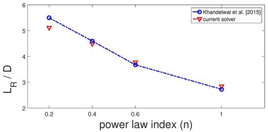 Reattachment length comparison results between the CFD code and values in [64] for power law fluids at Re = 100 with different power indices.