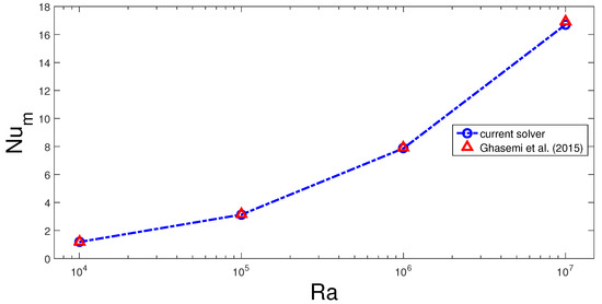 Validation was performed by using different sources available in the literature. In the first work, numerical results for shear thinning non-Newtonian power law fluid in a T-channel were used [64]. For the reattachment length, they developed a correlation in terms of the Re number and n value (power law index). Comparisons of the reattachment lengths are shown in Figure 3 for different n values at Re = 100. At the lowest power law index, the highest deviation between the reference results was obtained as 5%. In another work, C-HT in a cavity with MF is considered and results in Ref. [65] are used. Comparison results of the average Nu number for various Ra number at Ha = 30 are presented in Figure 4. The highest difference below 2% was obtained. These results show that the code is capable of capturing the flow recirculations with the power law fluid and MF effects in C-HT.