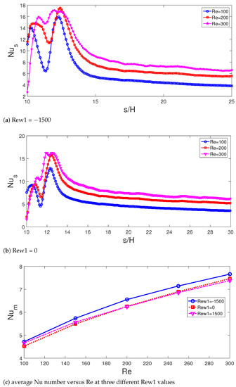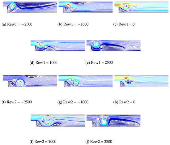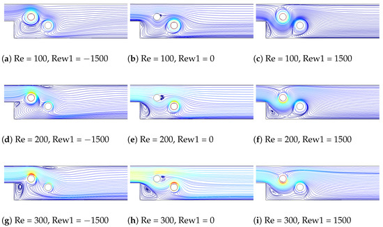 Figure 5 presents the flow pattern (FPT) distributions for the varying Re number at two different first cylinder Rs. For the non-rotating first cylinder case (b,e,h), vortices are formed behind the step at Re = 200 and Re = 300. The vortex size increases with a higher Re number, but it is not significant due to the presence of MF effects and the rotation of the second cylinder. The weak re-circulation regions are formed behind the first cylinder (the one closer to the step) at the highest Re. The negative value of the Rew number denotes the clockwise (CW) rotation of cylinders. In this case, at a lower Re number, the effects of rotation become important while part of the flow is directed towards an upper channel wall after the step due to the rotation of the first cylinder. As the Re number is increased, the fluid velocity becomes even higher due to the reduced gap between the first cylinder and the upper channel wall. Vortices are established after the step and in the upper wall at Re = 300. When the first cylinder rotates in the counter-clockwise (CCW) direction, the fluid flow is forced to flow below it due to the rotation while a small vortex is formed behind the step at Re = 100. When the value of Re number is increased, the vortex size after the step increases while more flow is directed toward the exit due to the increased fluid velocity and CW rotation of the second cylinder. Local Nu number variation shows two distinct peaks for Rew1 = 0 while the value of the first one is smaller. As the Re number is increased, a shift in the location of the peak Nu number was observed while the values were also enhanced. At Rew = −1500, the value of the first peak increased compared to cases for Rew1 = 0 while the location of peaks also varied with different Re numbers. It can be seen that the presence of rotating cylinders makes the flow field complicated near the step location where forced convection due to the rotational fluid velocity either aids or opposes the fluid flow. The average Nu rises with higher Re numbers while values are even higher with CW rotation of the first cylinder for all Re numbers. However, the deviations with the RC case are below 5% as compared to the motionless cylinder case for all Re numbers (Figure 6).