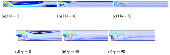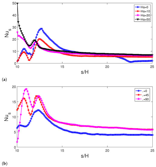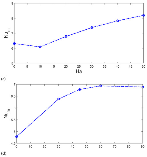 As regards the MF effects, many investigations are performed for C-HT in the channel or in cavity flow applications. In the latter case, the MF retarded the flow and reduced the C-HT rate. However, depending upon the configuration in channel flow, the MF effects have the potential to increase the HT rate. As the flow over BFS is considered, in the absence of MF, multi re-circulation regions are established for the power law nanofluid flow (Figure 9a). Large vortices can be seen on the upper and lower channel walls downstream from the step, while near the step and RCs, two vortices appeared for this flow condition. As the MF strength is increased to Ha = 10, the vortices downstream of the step were significantly suppressed while at the highest MF strength, they disappear. As the MF inclination is considered, vortex zones are also greatly influenced by the variation of . The upper channel vortex appeared for a horizontal inclination at while it disappears and the small vortex behind the step was formed for vertical inclination at (Figure 9). Due to the change of vortex size and its location near the step and on the bottom wall, the value of local peaks in the Nu significantly change with the varying MF strength and its inclination. At Ha = 30 and Ha = 50, the first peak disappears due to the suppression of the vortices while the second peak’s value also reduces. The value of the second peak in the local Nu is the highest at Ha = 0. The average Nu number generally rises with the MF inclination and strength while there is a slight reduction from Ha = 0 to Ha = 10. There is a 30% increment when the MF strength is increased to Ha = 50 from Ha = 0 while the amount is 44% when cases with the horizontal and vertical MF inclinations are compared (Figure 10).