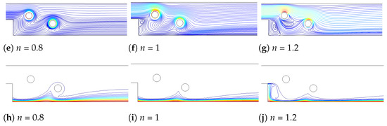 The fluid thermophysical properties also play a role in the amount of CHT intensification. In the present work, a non-Newtonian power law nanofluid was considered. The power law index and SP-VM amounts are the key parameters considered while a particle diameter of 20 nm was selected. The power law index of the fluid effects on the FP and TP variations are presented in Figure 11. As compared to the Newtonian fluid case, vortices were formed behind the step and in between the cylinder for a shear thickening fluid while vortices disappeared for a shear thinning fluid with double RCs under MF effects. Thermal gradients become enhanced with higher values of n on the bottom wall. Local peaks in the Nu number rise with higher values of power law index and the location of the first peak moves away from the step for n = 1.2. The local Nu achieves higher values downstream of the step with higher n values due to the increased fluid velocity for the same Re number. The location of the first peak in the local Nu number becomes 10.52 H, 10.73 H and 10.94 H, while the values become 8.67, 8.96 and 17.8 for n values of 0.8, 1 and 1.2, respectively. The average Nu significantly increased with a higher n value while the average Nu at n = 1.2 became 2.75 times the value at n = 0.8 for configuration with double RCs (Figure 12). Including nanoparticles and increasing the SP-VM resulted in C-HT enhancement. The enhancement of the average HT depends upon the value of n while they were obtained as 34%, 36% and 36.6% for n values of 0.8, 1 and 1.2, respectively, at the highest SP-VM (Figure 13).