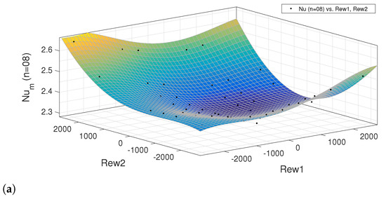 The polynomial coefficients for different power law indices are given in Table 1 with their 95% confidence bounds. The performance metrics of the polynomial fit are presented in Table 2 by using R and the root mean square error (RMSE). This fourth-order polynomial model shows effects of the interaction between RCs and their Rs on the variation of the average Nu number where a surface plot for an average Nu and the resulting residuals between the CFD and polynomial fit are also given in Figure 14.