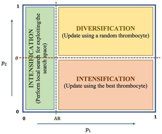 Once p1 > AR, the thrombocytes are activated and are ready to encounter some change in their positions. We can update the positions based on either diversification (exploration) or intensification (exploitation) as discussed below: