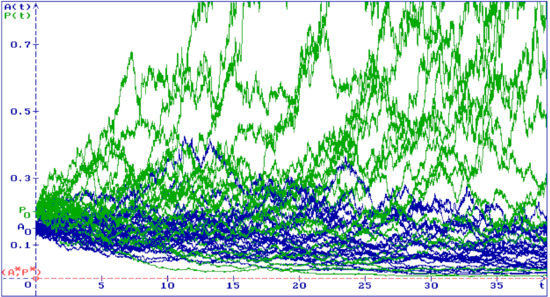 In Figure 2, 25 trajectories of the solution of Equation (5) are shown with , , , and , and the same values of all other parameters as in Figure 1. The conditions (15) hold, stabilization by noise’ occurs, and all trajectories converge to the unstable equilibrium .