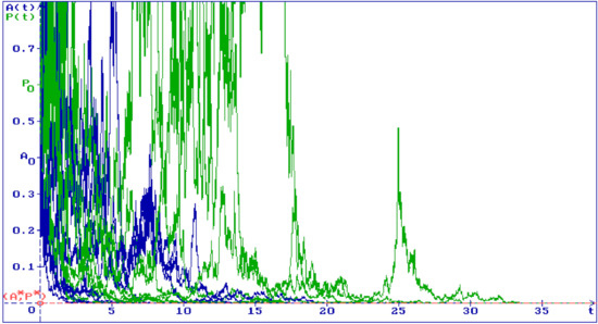 The 25 trajectories of (blue) and (green) of a solution of the system (5), with , , , , , , , , , and .