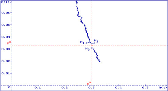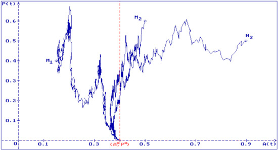 In the system (9), and , i.e., the second condition (14) does not hold. So, in the deterministic case, the equilibrium is unstable.