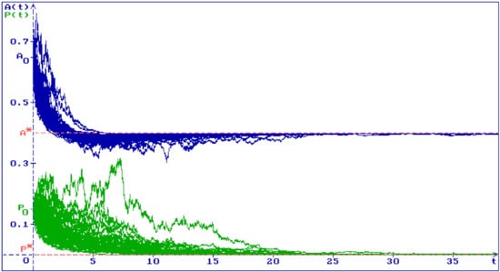 In Figure 4, 50 trajectories of the solution of Equation (5) are shown with , , , and , and the same values of all other parameters as in Figure 3. All trajectories converge to the stable equilibrium .