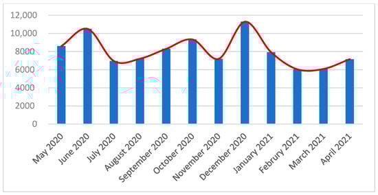As computer and network technologies develop, the informationization of society continues to expand rapidly. People’s lifestyles and business activities are gradually changing because of digitalization. Although the utilization of network technology has brought great convenience to society, individuals, enterprises, and other organizations are under the threat of malicious network attacks all the time. Figure 1 shows the number of European Union (EU) users attacked by financial malware from May 2020 to April 2021 []. Therefore, safeguarding personal privacy, industry development, and national security in networks are top priorities. More than half of global enterprises spend money to improve the security of their systems [], and the cost of network security investment creates additional high overhead costs. However, at the same time, these enterprises still perceive their systems as being vulnerable. It follows that organizations, who are the defenders of network security, are constantly faced with the issue of controlling security investments.