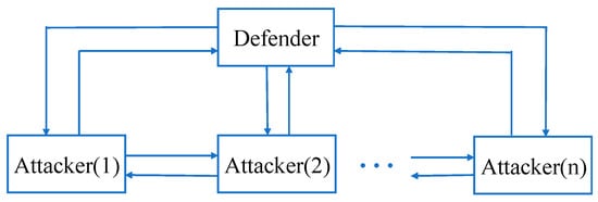Network attack-defense refers to the detection, intrusion, remote control, and data theft of a target network or information system by an attacker by some means, while the defender uses specific means of network protection to secure itself []. The essence of network security is an adversarial game between attackers and the defender. It is a significant challenge for the defender to choose the appropriate defense strategy in the face of complex attacks []. In recent years, scholars have used game models to analyze network attack and defense behaviors and to conduct research on defensive strategies and have achieved various results.