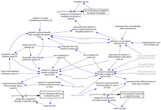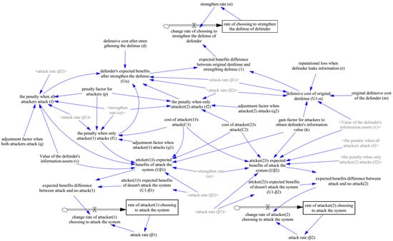 According to the above assumptions and analysis, this paper uses Vensim DSS v5.6a to construct an evolutionary game model for network attack and defense, which is comprised of three sub-systems: the defender, attacker (1), and attacker (2), as shown in Figure 3. The rectangles represent level variables that show the cumulative results. The valves represent the rate variables showing the physical flows of the items feeding into or depleting the model. The other variables are exogenous and auxiliary variables. This model includes 3 level variables, 3 rate variables, 8 exogenous variables, and 15 auxiliary variables. Setting the functional relationship between all of the variables depends on the above equations, Equations (1)–(10).