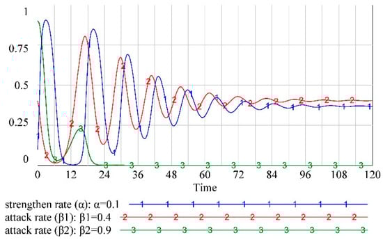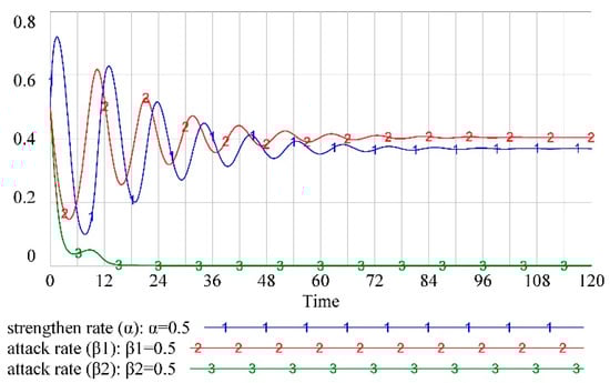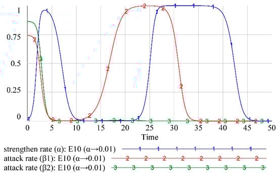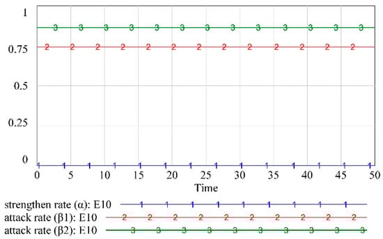 The simulation results that are obtained in the next step after substituting into the system dynamics model as an example are shown in Figure 4. This result demonstrates that the defender, attacker (1), and attacker (2) are not actively changing their own strategy choices and are in a relatively stable situation. However, whether is an ESS still needs to be tested. A population adopting ESS should be sufficient to resist small mutations []. We made a tiny mutation in the initial strategy of attacker (2), i.e., we changed the defender’s from 0 to 0.01, and the model was re-simulated, the results of which are shown in Figure 5.