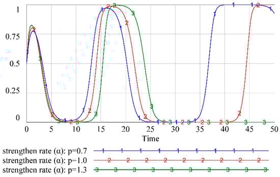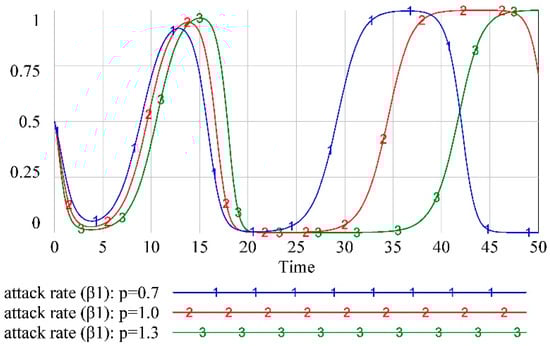 The most common management strategy that is used by scholars who study network attack and defense games is to increase the cost incurred to the attackers or to increase the penalty for the attackers. In the above model, adjusting the defender’s penalty intensity to the attackers, i.e., the defender’s penalty factors to the attackers are changed from to and , and the initial strategies of the three players are set as , , . The strategy choices of the defender and attacker (1) under different penalty strengths are shown in Figure 6 and Figure 7.