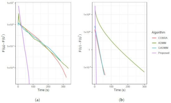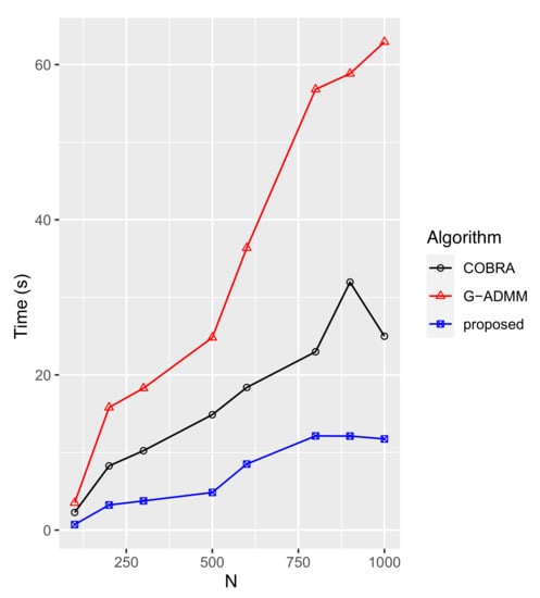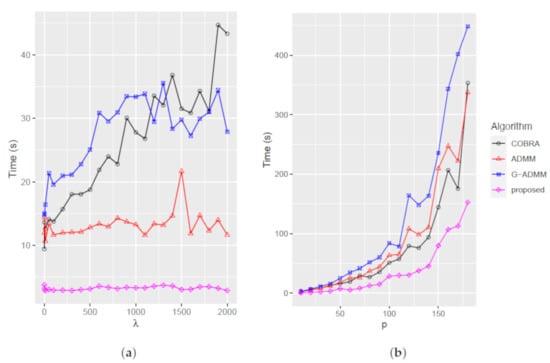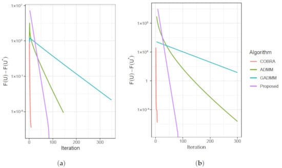 Lastly, we compare the number of iterations to achieve the specified tolerance of and run it on the TCGA and DLBCL datasets. Figure 6a,b reveals that the COBRA algorithm has the fastest convergence rate, whereas the generalized ADMM is the slowest to converge. Our proposed method shows competitive performance in the convergence rate.