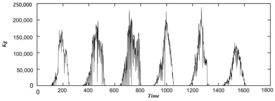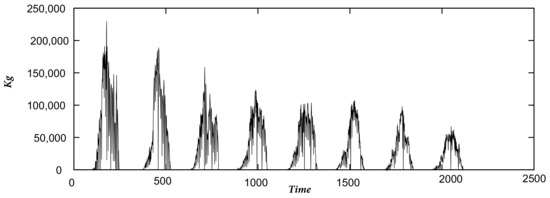 Since the fruit picking season begins on a different date each year, we handled the datasets as follows: if for each company, corresponds to the first day of the period that started earlier and to the last day of the period that ended later, then we establish that each period starts at and ends at , filling in the days where there is no fruit picking with zeros. Finally, we join the series of each period in chronological order, obtaining a single time series for each company. The time series of coop1 contains 1642 data points, that of coop2 2130 data points, and that of coop3 1633 data points, as represented in Figure 1, Figure 2 and Figure 3.