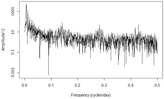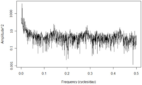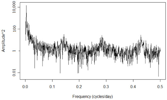 Figure 4, Figure 5 and Figure 6 show the log–log analysis of the squared amplitude against the frequency in cycles/day, presenting a broad spectrum for each company. Therefore, we can conclude that the data are neither periodic nor quasi-periodic. Furthermore, the data do not correspond to white noise. Wide peaks are observed at different frequencies, showing the influence of the past in both the short and long term, representing a seasonal influence.