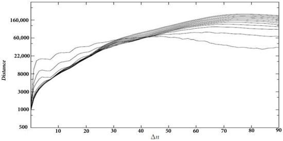 In Figure 7, we show the graphs of on a logarithmic scale (which has the same slope as on a linear scale, but the values on the y axis represent distances instead of logarithms of distances) for the series of coop1, for varying between 0 and 90, with embedding dimensions 2 to 13, , and a delay of 1 day [59]. There is a linear increase for between 36 and 60 and dimensions 5 and above. This suggests the existence of an attractor.