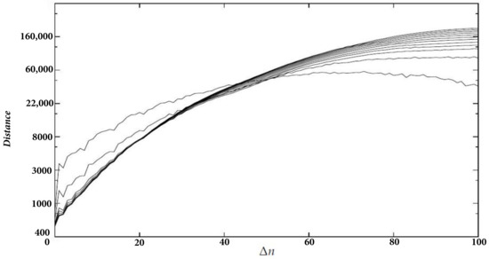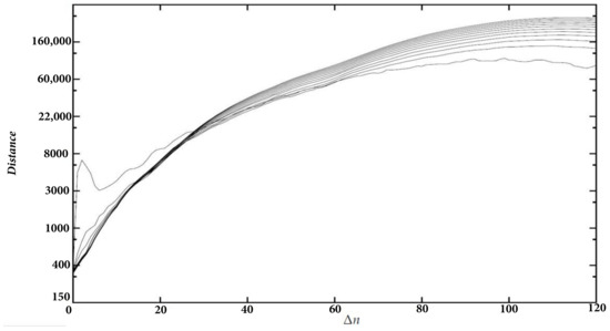 Given a time series , we use a time-delay embedding to form a series in Euclidean m-dimensional space [51,57,58]. We choose a distance and define the map