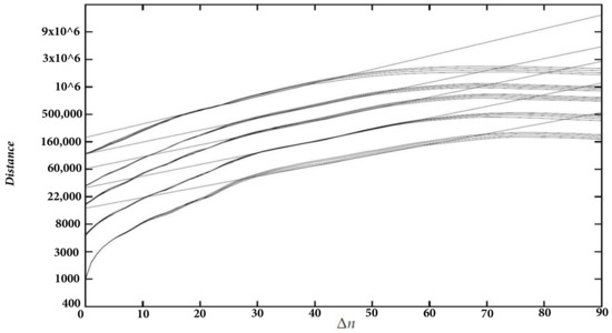 Now, we verify that there are linear increases for other values of the radius and compute the exponent. In Figure 10, we plotted the graphs of coop1 for 2500, 5000, 7000, 9000, and 14,000 and dimensions between 10 and 13, again with a delay of 1 day. Each group of curves corresponds to a value of . For the sake of visibility, we displaced each curve a given amount upwards depending on .