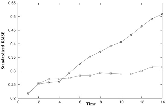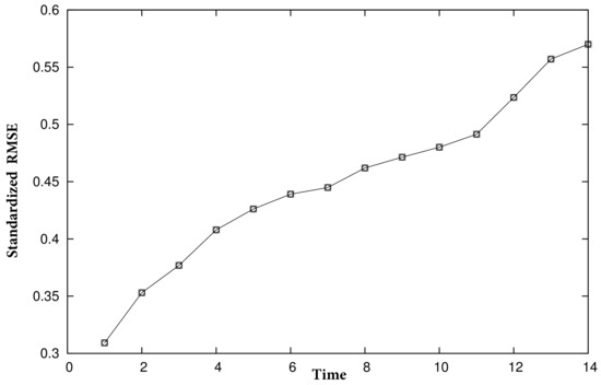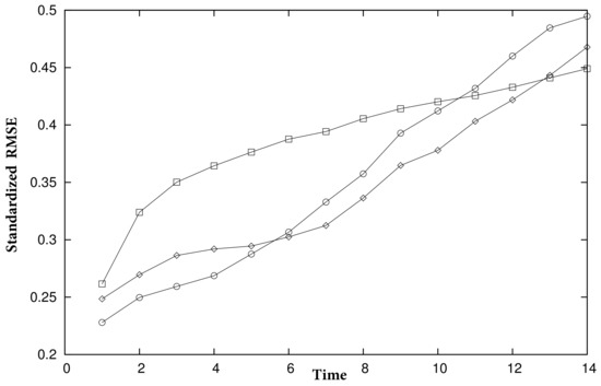 Finally, we used these parameters to perform predictions for each series’ last season and to compute the errors. In detail, for each day in the last season, we forecasted two weeks in the future; that is, for day i and prediction horizon , we made a prediction for day . Then, for each , we computed the root mean squared error , where is the real data from the series, and we divided it by the standard deviation of the last season’s data. We summarize the results in Figure 12, Figure 13 and Figure 14. Lines with circles correspond to the parameters for days 1 to 7, lines with squares correspond to days 8 to 14, and lines with diamonds correspond to days 1 to 14.